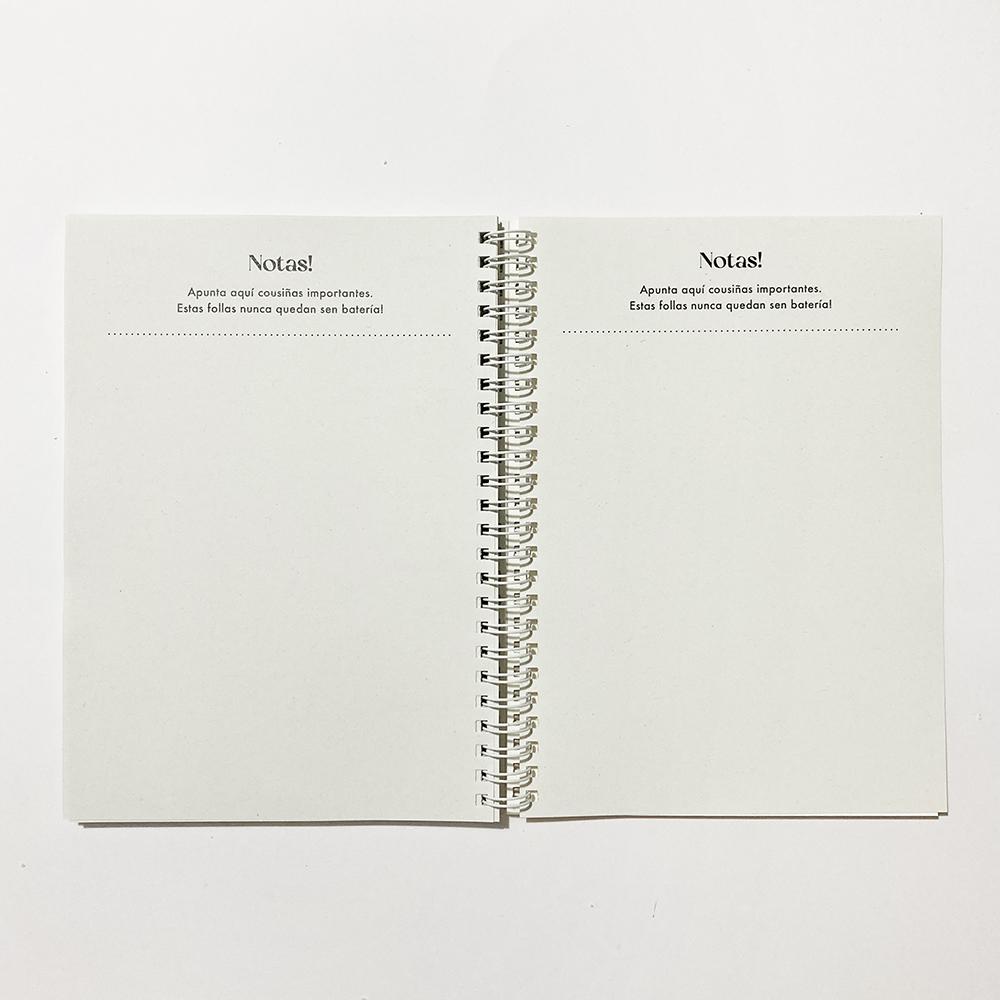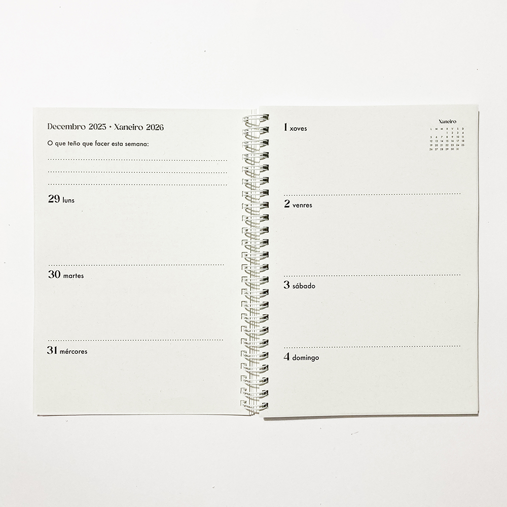 É unha axenda semanal (semana vista), tamaño A5. Onde tamén poderás atopar un práctico calendario mensual ao comezo de cada mes, para ter todas as tarefas á vista e non esquecer nada.