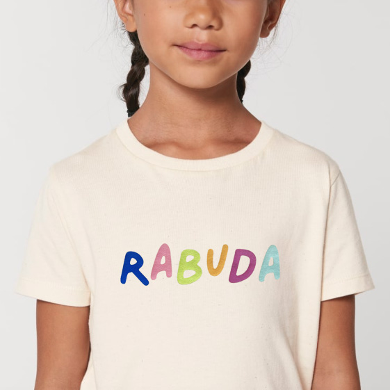 Camiseta de moza, de manga curta, corte recto e non moi longa. En cor gris antracita e serigrafía en tinta rosa.