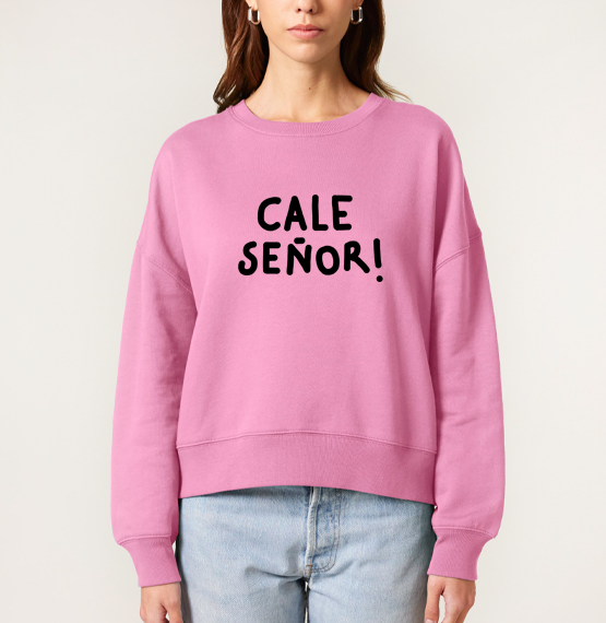 Suadoiro de moza, de corte amplo “oversize” e non moi longo, con ombreiros caídos. En cor rosa chicle e serigrafía en tinta negra.