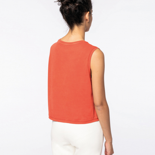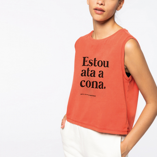 Top “Estou ata a cona” en cor tella efecto lavado. Sen mangas e curta pola cintura, de corte amplo.